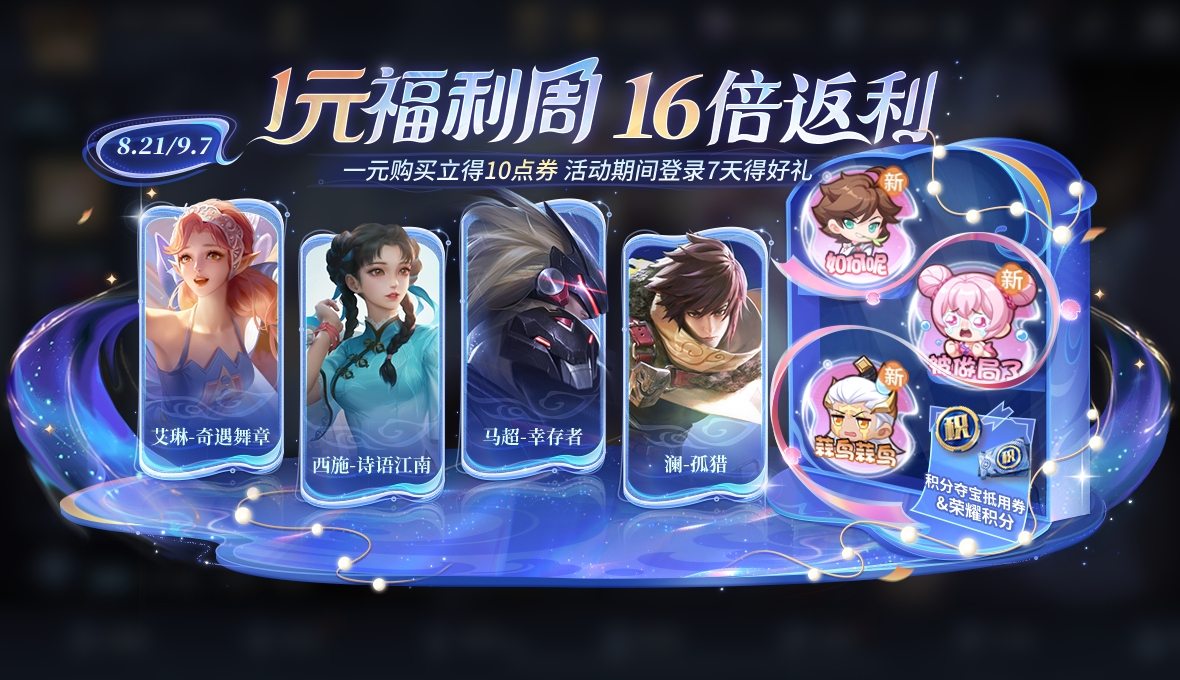 活動簡介:在活動內1元購買10點券,登錄7天可領16倍返利,還可隨機獲得皮膚,全新個性表情或積分奪寶抵用券其中之一!