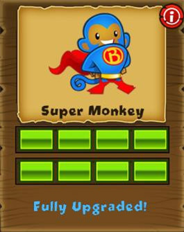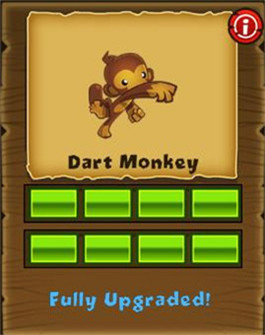 (每發飛鏢可以攻擊2個氣球)→(每發飛鏢可以攻擊3個氣球)→(每次可以發射三枚飛鏢)→(增加“變身”技能,把攻擊范圍內的飛鏢猴變成超猴)