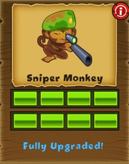 狙擊手猴,全屏幕射程,射速慢,初始每槍穿透兩層氣球,建議點擊后選擇“strong”攻擊模式。