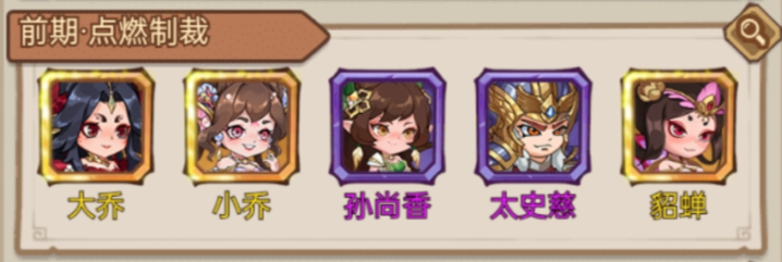 以吳國陣容為班底,延續(xù)第二回合傷害;輸出以大喬為核心,其他武將可均衡培養(yǎng),貂蟬回復(fù)前排提高前排攻擊,為第二回合打下鋪墊。