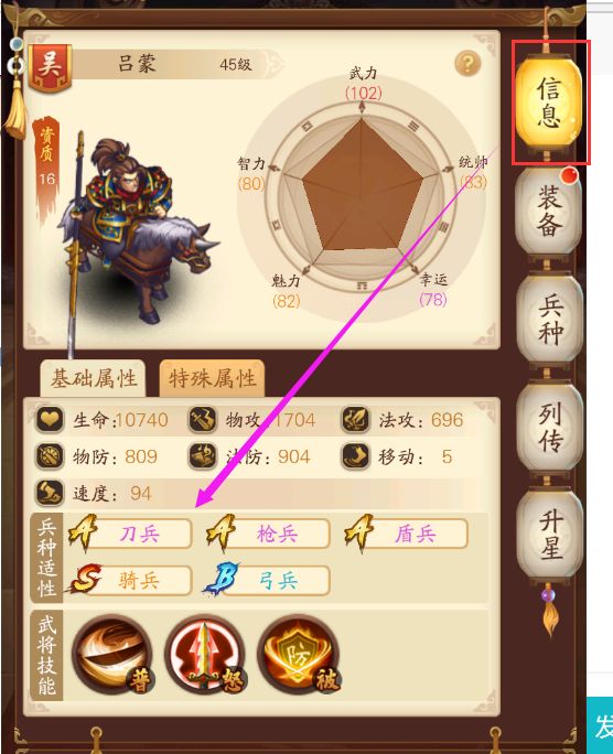 ⑧在角色的信息界面,如下圖所示,可以看該名將的兵種適性,選擇合適的兵種,能發揮更高的戰斗力。