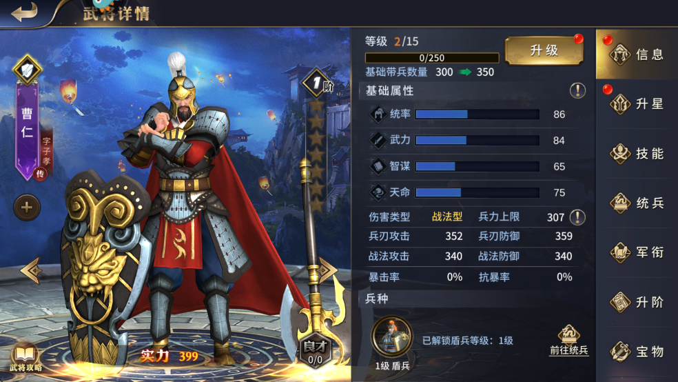 1、曹仁,戰(zhàn)法輸出型盾兵武將,主屬性統(tǒng)率,技能上偏向針對(duì)高額兵刃輸出的陣容。