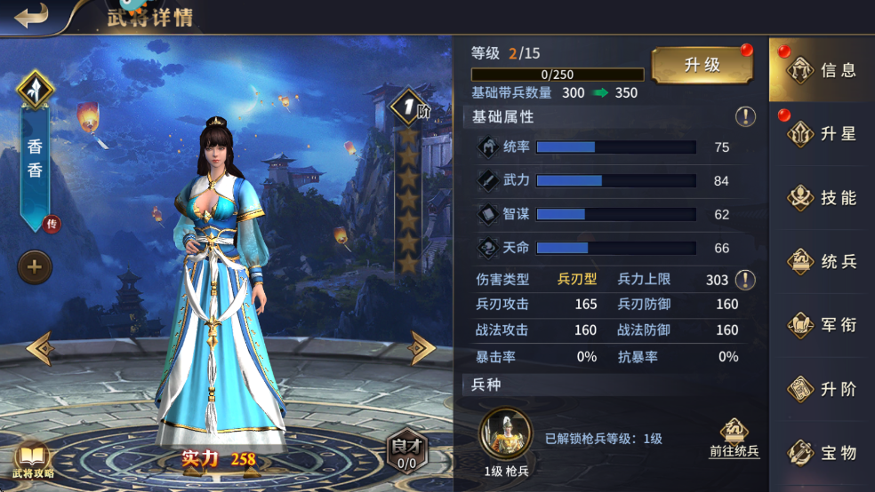 1、香香,兵刃輸出型槍兵武將,主屬性武力,作為沒落世家之女,而今長(zhǎng)成為一名能上陣的武將,不可謂不驚嘆!