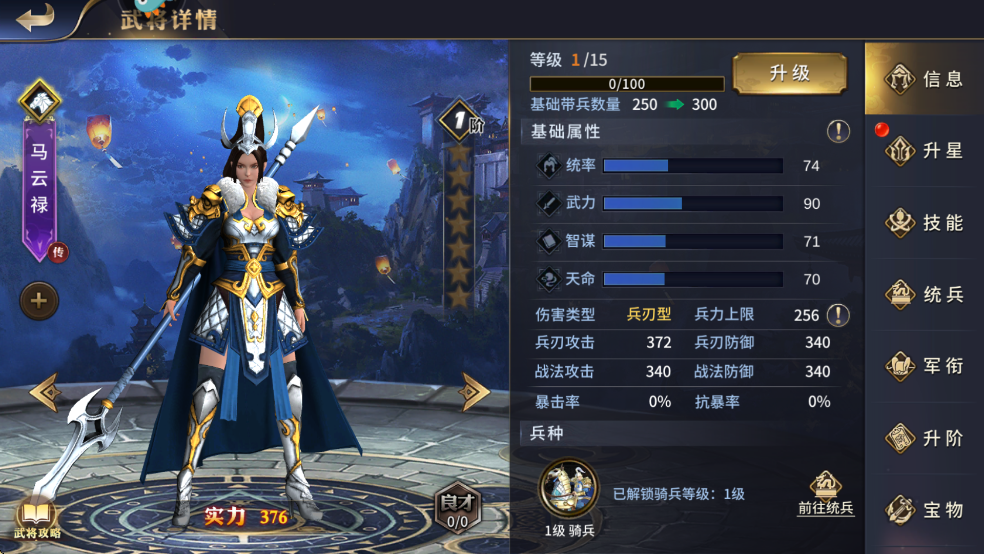 1、馬云祿,兵刃輸出型騎兵武將,主屬性武力,技能設(shè)計(jì)上專門克制盾兵,意在充分發(fā)揮騎兵的兵種特性,擊殺敵方盾兵,以取得兵力優(yōu)勢(shì)。