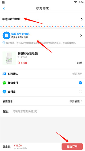 4、選擇收貨地址,完善用藥人信息,然后點擊“提交訂單”選項付款即可。